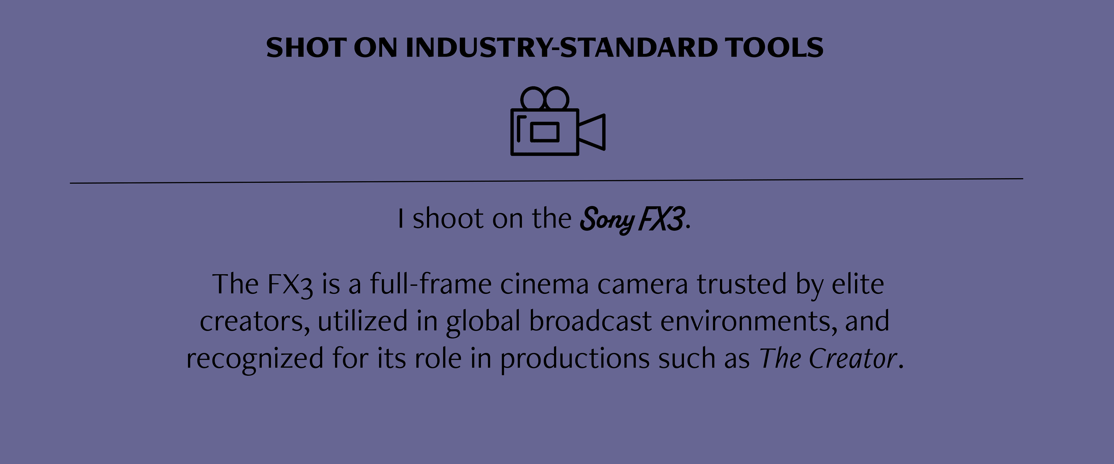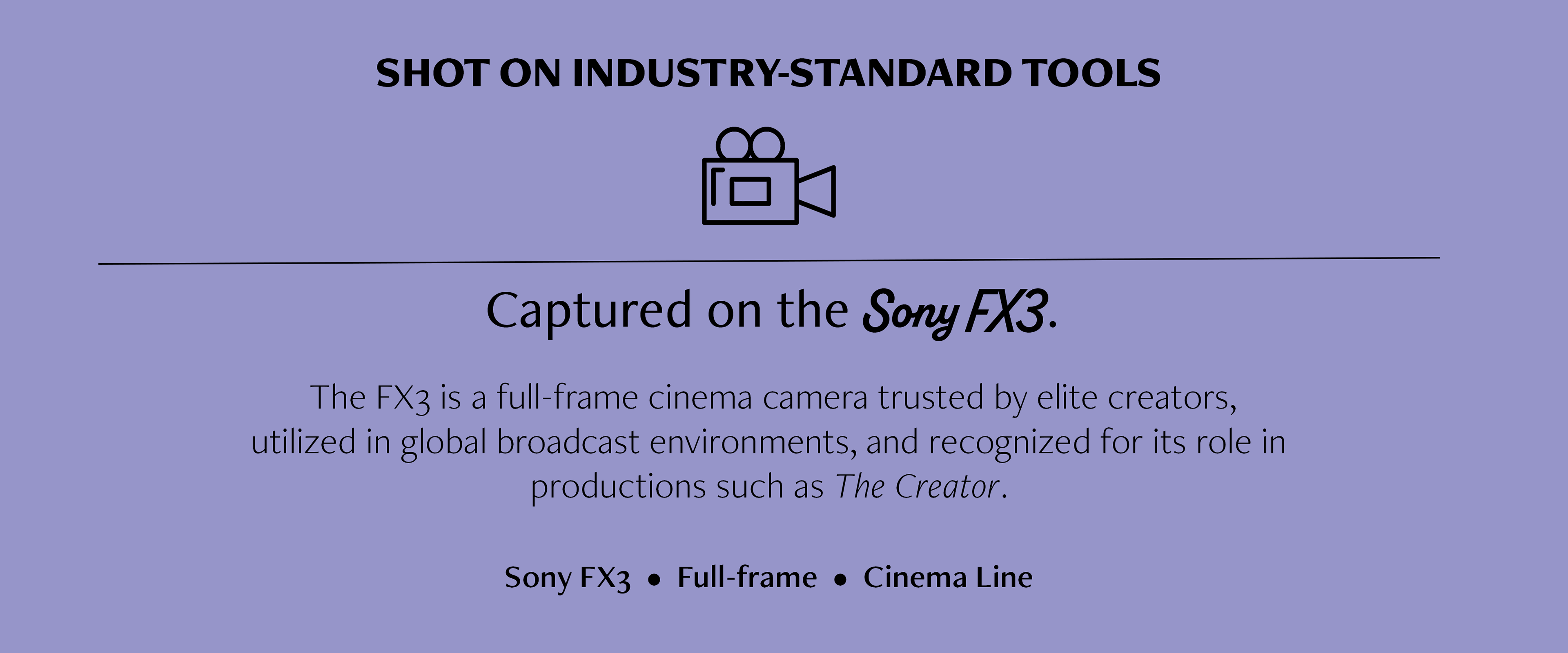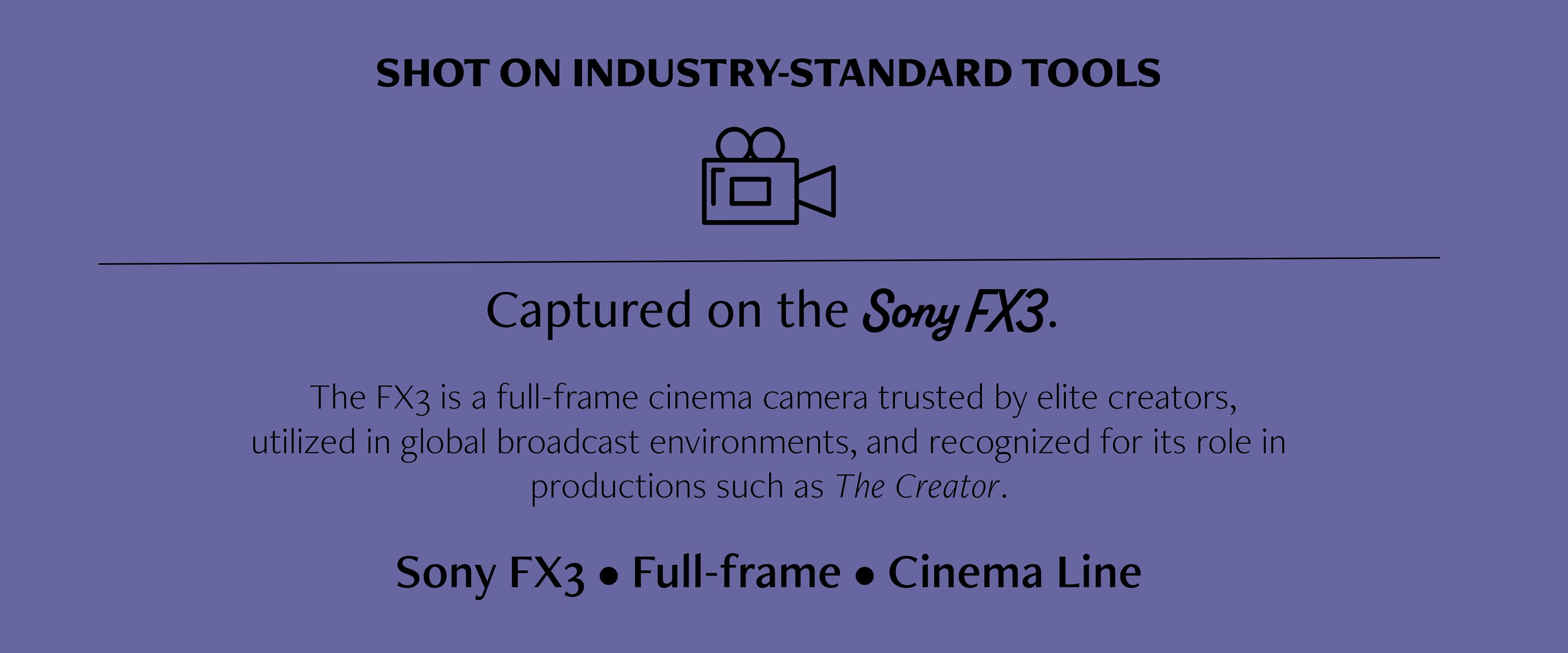 The FX3 is a full-frame cinema camera trusted by elite creators, utilized in global broadcast environments, and recognized for its role in productions such as The Creator.