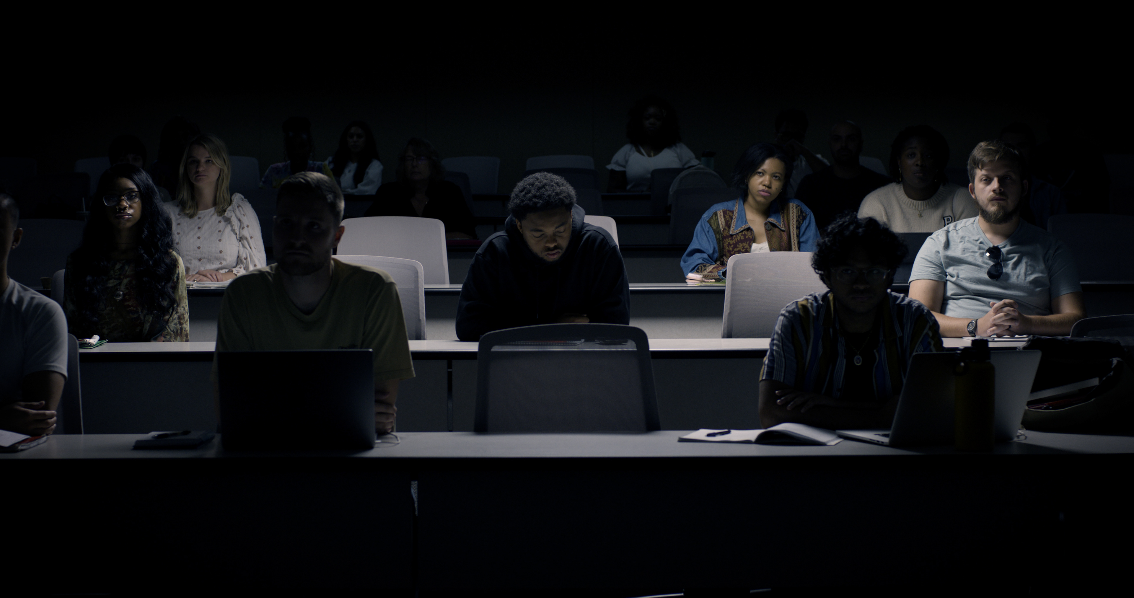 Evan sits in class as his professor singles him out for his lack of focus. His almost expressionless classmates surrounding him. Our focus is only on Evan during the scene. - AFTER